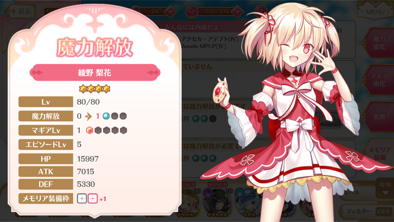 マギアタイプだから別段ステータスが強いわけではないこと…これは梨花も一緒何だけど、まあ★5になれば多少は強くなるだろう